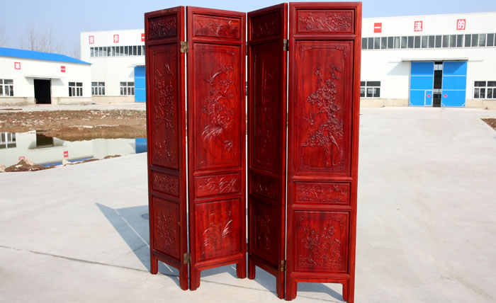 江蘇中尊木業(yè)有限公司屏風系列產(chǎn)品:梅蘭竹匊掛屏、四季花折屏四件套等。